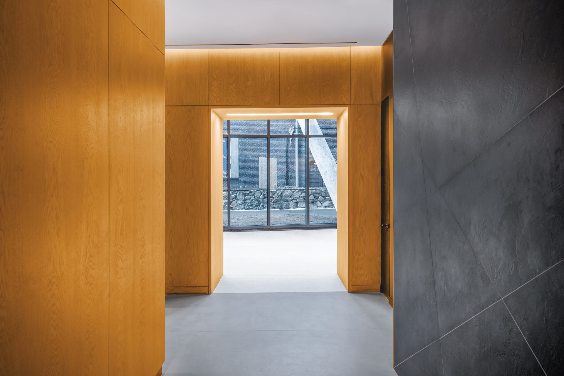 Wall paneling. Wood wall slats. Reception desk. Locker wall. Bench seating. Integrated man doors installed and clad to be flush with wall panels. Floor signage number feature walls with slats.